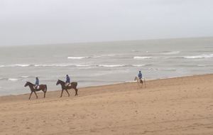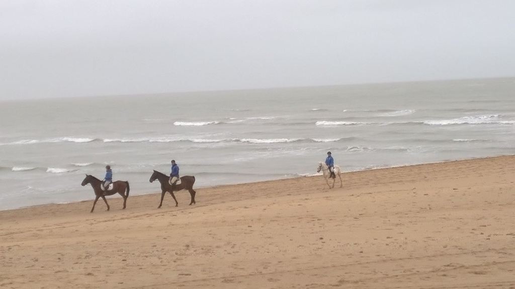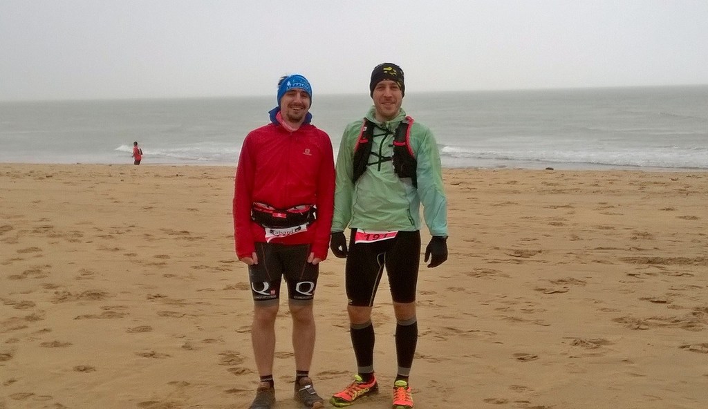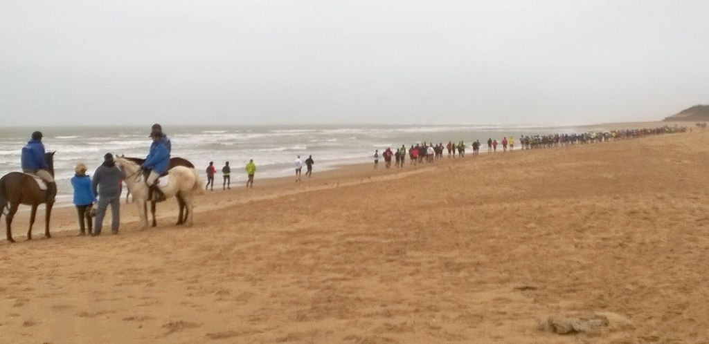 Après la traditionnelle bière de récupération du samedi soir et une nuit écourtée d'une heure (dur dur de se lever, merci l'heure d'été !) le couvert est remis le dimanche matin. Max et Sam sont les premiers à partir pour une balade de 26 km qui va faire mal aux pattes !!!! Pas de pression spéciale, le but étant de faire de la distance. Max décide de rester avec Sam pour faire course commune après avoir enchainé les sorties dans la semaine. C'est derrière les chevaux au galop et par un fort vent de face que le départ est donné. Après un rapide passage le long du littoral, les 257 coureurs s'enfoncent doucement dans la forêt de la Terrière. Le parcours reprend des portions de la veille et la lumière du jour nous permet de mieux profiter du paysage. Le temps est idéal pour courir, seul le vent nous rappel que la mer n'est pas très loin.